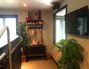 2,400 sq. ft. wedding suite (sleeps 8), wheelchair accessible, 3 full washrooms, kitchen, theatre, children's playroom, walk-out patio with tables, chairs, propane barbecue, and fire table. 1 room log cabin (sleeps 2). Camping area, no services, access to washrooms and showers in event building.